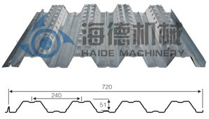 該機生產(chǎn)的鋼樓承板形狀簡潔、波度大、強度高、安裝時鋪置點焊鋼筋網(wǎng)后與混凝土現(xiàn)場澆灌結(jié)合,粘合性好。在高層建筑上既可以省去鋼模板又可以減輕樓層承載,在達到同等承受能力的前提下,使工程用鋼量減少,從節(jié)省投資。