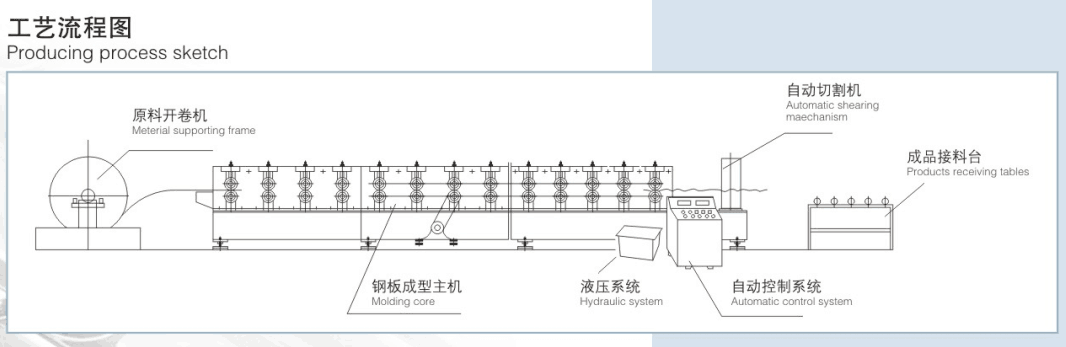 該機主要由進料導入平臺、成型主機、成型剪切裝置、液壓站、電腦控制系統(tǒng)等幾部分組成。